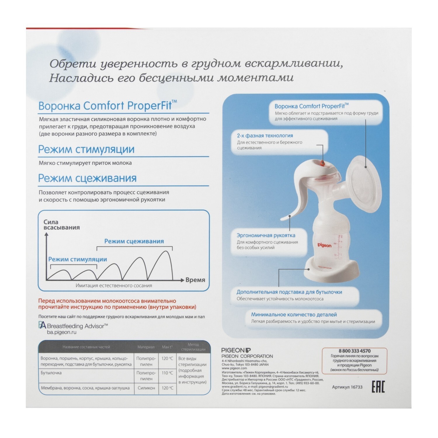 Молокоотсос ручного типа незаменим, когда естественное вскармливание невозможно из-за проблем с грудью и сосками. Он также идеально подходит для сцеживания молока с целью его хранения. Молокоотсос Pigeon имеет два режима работы: "режим стимуляции" и "режим сцеживания". Первый режим мягко стимулирует грудь, подготавливая ее ко второму этапу.