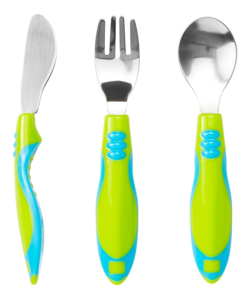 Комплект состоит из ножа, вилки и ложки, выполненных в оригинальном практичном дизайне. Для удобного захвата предусмотрены ручки с рельефными вставками, таким образом, малыш с легкостью сможет удерживать приборы. Ручки короткие для лучшего контроля при поднесении еды из тарелки ко рту. Нержавеющая сталь обеспечит безопасность для ребенка и долгий срок службы. Округленные кончики не позволят пораниться. Неглубокие полости на концах вилки и ложки позволяют кормить малыша небольшими порциями. Особая форма ножа помогает ребенку быстро освоить режущие движения.